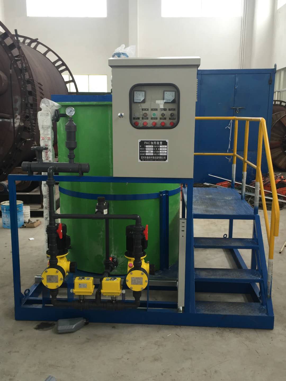加药装置由溶液罐、若干法兰、阀门等组成。配置两台计量泵,两台计量泵为一用一备,这样方便用户在不停机的状态下进行检修、更换配件。