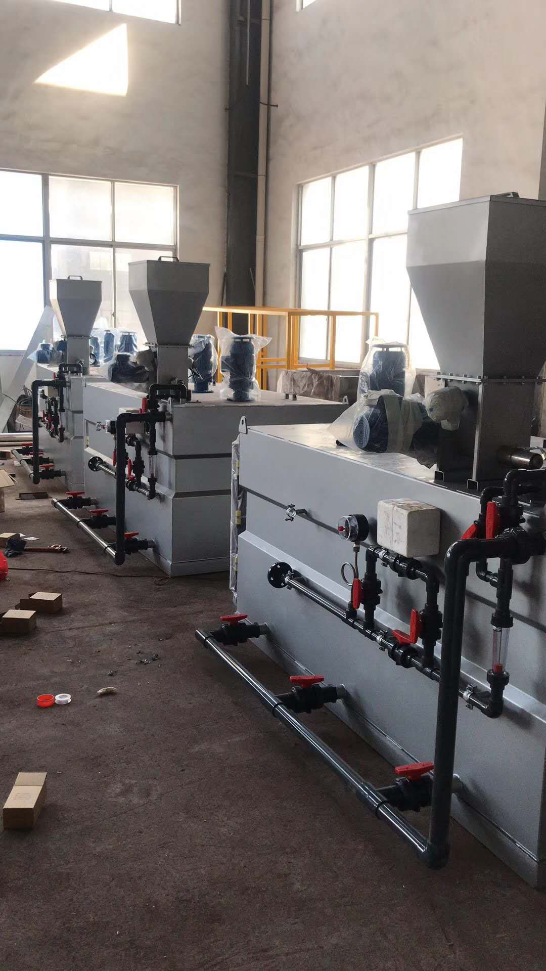 加药装置由溶液罐、若干法兰、阀门等组成。配置两台计量泵,两台计量泵为一用一备,这样方便用户在不停机的状态下进行检修、更换配件。
