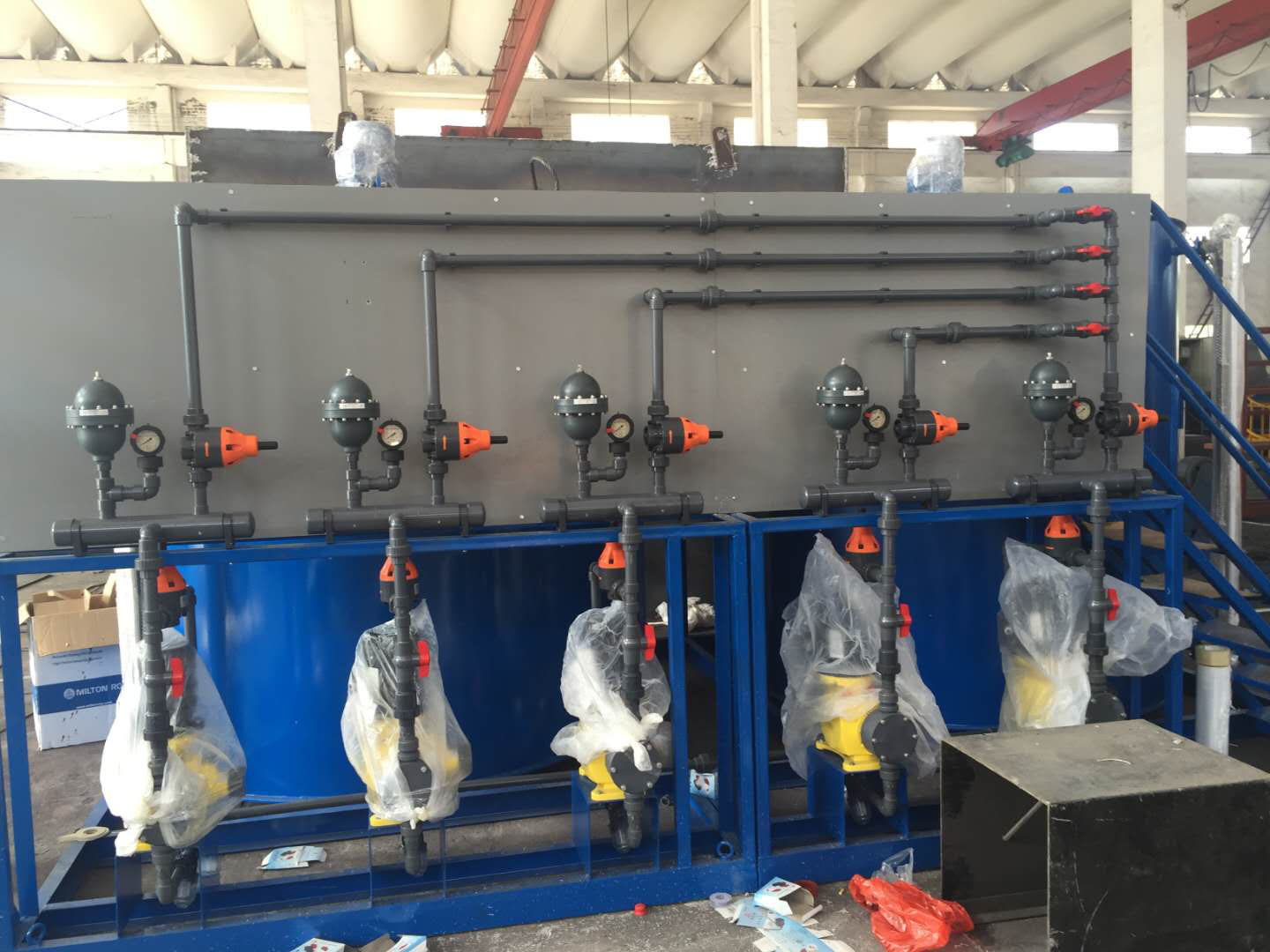 加药装置主要由溶液箱、搅拌器、计量泵、液位计、电控柜、管路、阀门、安全阀、背压阀、止回阀、脉动阻尼器、压力表、Y型过滤器等组成。